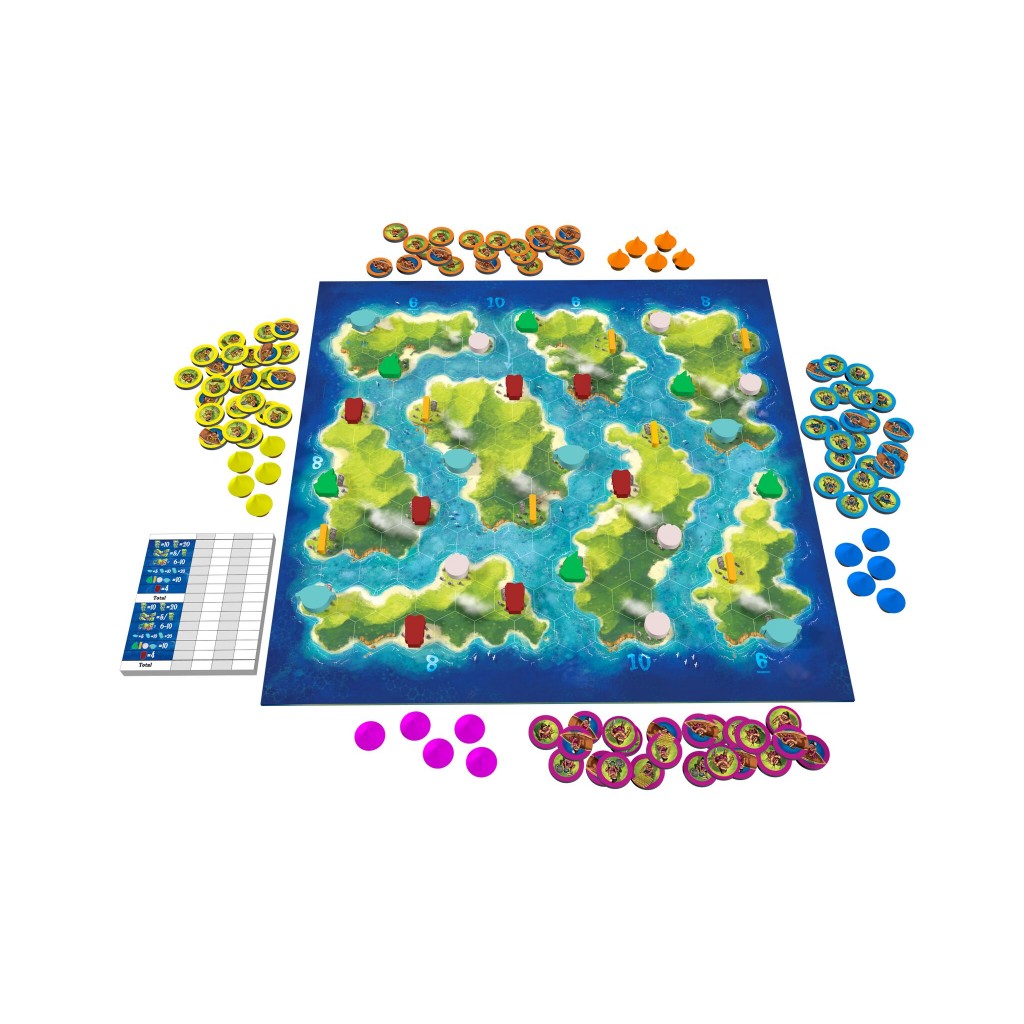 - 1 plateau de jeu - 32 pièces en bois - 6 roses « noix de coco » - 6 jaunes « bambou » - 6 vertes « pierre précieuse » - 6 turquoises « eau » - 8 brunes « statuette » - 20 huttes en bois (4x5 couleurs) - 30 jetons « colons » mauves - 30 jetons « colons » bleus - 30 jetons « colons » jaunes - 30 jetons « colons » oranges - 1 sac en tissu - 2 feuilles de score plastifiées - 1 feutre noir - 1 livret de règle |