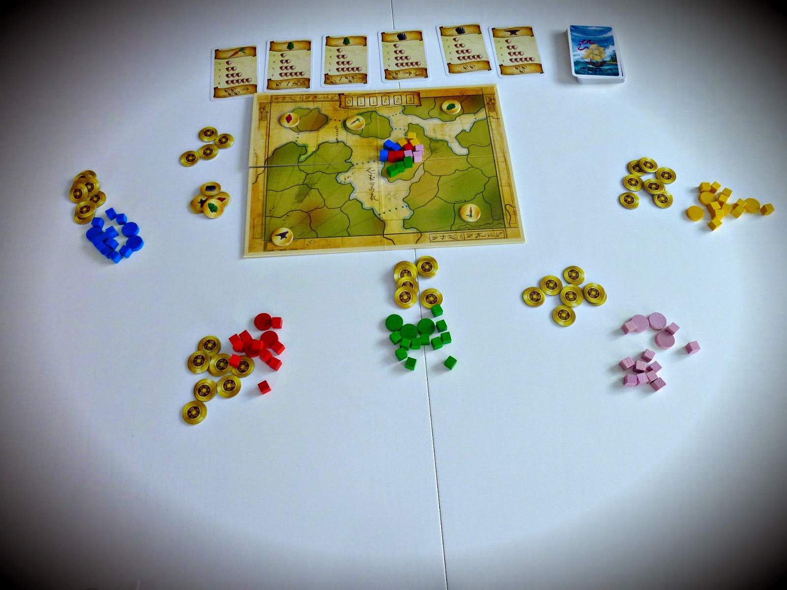 Après 8 à 11 tours (selon le nombre de joueurs), les joueurs marquent un point de victoire pour chaque région dans laquelle ils sont majoritaires, ainsi que pour chaque île dans laquelle ils contrôlent plus de régions que les autres joueurs. Ils ajoutent à ce points ceux octroyés par leurs cartes (bonus spéciaux et élixirs). Le joueur avec le plus de points remporte la partie.Contenu : - 4 séries de 18 cubes en bois (Armées) et de 3 tours en bois (Cités),